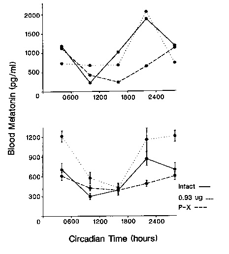 Figure 4: Blood melatonin levels in intact (solid line), P-X (dashed line), and P-X/melatonin infused (dotted line) pigeons sampled by venipuncture in DD at six hour intervals for 24 hours. P-X/infused pigeons whose blood melatonin levels of samples are shown here received 0.93 ug melatonin/hr for 10 hours (approximate circadian time 1900 - 2900) on the day of sampling. The 0400 data points have been double plotted at circadian time 2800. Top panel Individual pigeon (#20) Bottom panel - Summary graph of the average values (+ SEM); intact, n=20; P-x, n=28; P-X/melatonin infused, n=11.