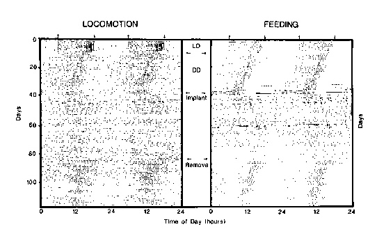 Figure 3: Effect of melatonin-filled silastic implants on the free running rhythm of locomotor and feeding activity of an intact pigeon. On day 41, eleven 1.0 em melatonin filled silastic capsules were implanted intraperitoneally and the pigeon placed back in DD (arrows). Several weeks later, the capsules were removed (arrows) and the bird was maintained in DD for the remainder of the experiment.