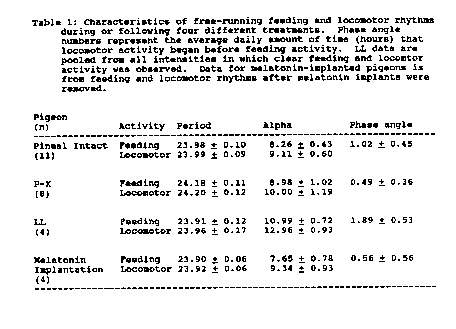 Effects of Pinealectomy, Melatonin Implants, and Exposure to Constant Light on Feeding and Locomotor Rhythms in the Pigeon,