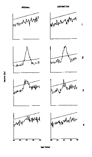 Figure 2: Selected Chi-Square periodogram analyses of the behavioral records presented in figure 1. Panels (from top to bottom) - sections 1, 2, 3, 4 from figure 1.