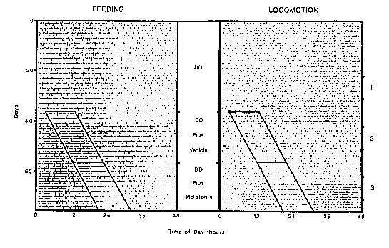 Figure 4: Representative feeding and locomotor records from a P-XfE-X pigeon in DD before infusions, during vehicle infusion and during melatonin infusion. Numbers on the right side of figure correspond to the periodogram analyses in figure 5. Period of infusion = 24.51.