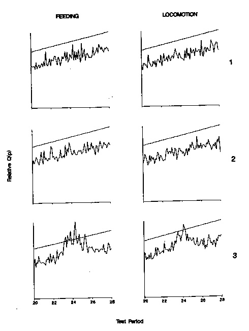 Figure 5: Selected Chi-Square periodogram analyses of the behavioral records presented in figure 3. Panels (from top to bottom) - sections 1, 2, 3, 4 from figure 3.