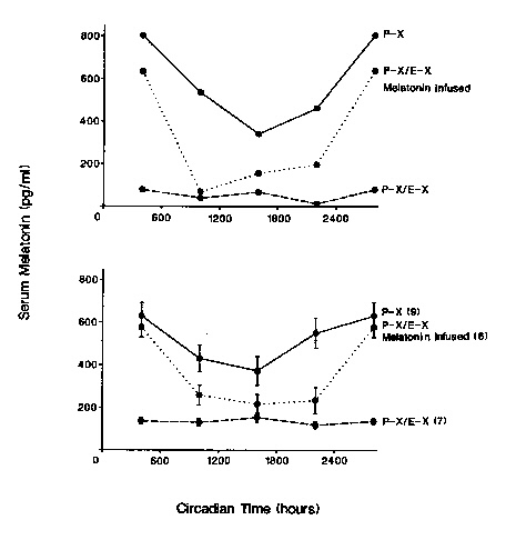 Figure 7: Blood melatonin levels from P-X (dotted line), P-X/E-X (dashed line) and P-X/E-X/melatonin infused (solid line) pigeons in DD sampled by venipuncture at sjx hour intervals for 24 hours. P-X/infused pigeons whose blood melatonin levels of samples are shown here received 0.93 ug melatonin/hr for 10 hours on the day of sampling. The first data points (circadian time 0400) have been re-plotted at 2800. Numbers of animals are in parentheses (n). Top panel - Individual pigeon (#nbblkblu) Bottom panel - Summary graph of the average values (+ SEM).